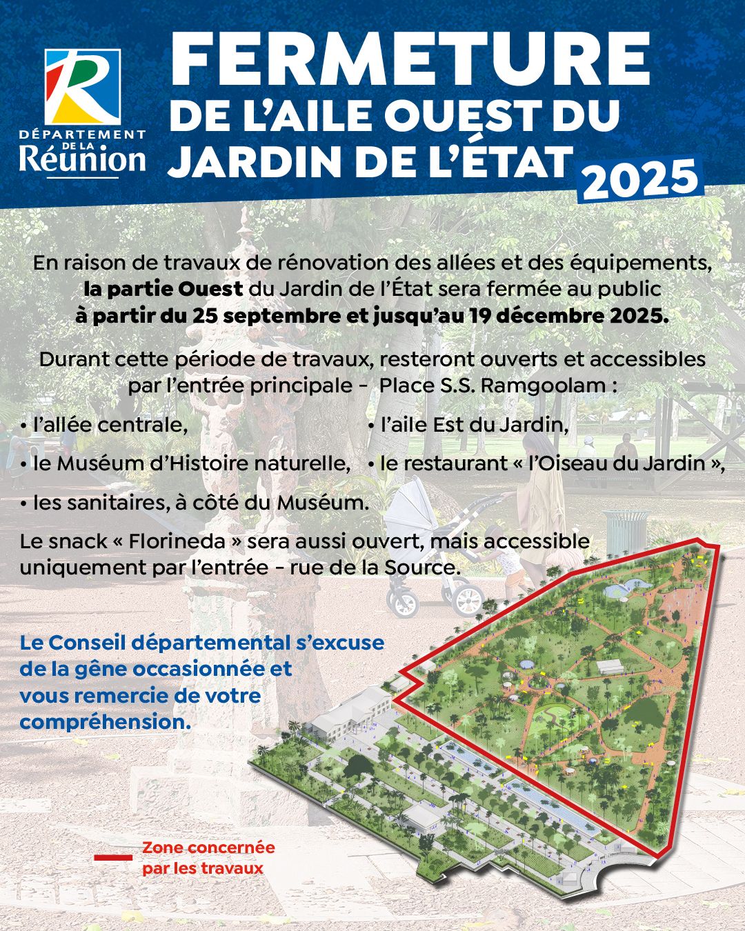 Voici le communiqué du département de la Réunion concernant le Jardin de l'Etat à Saint-Denis.