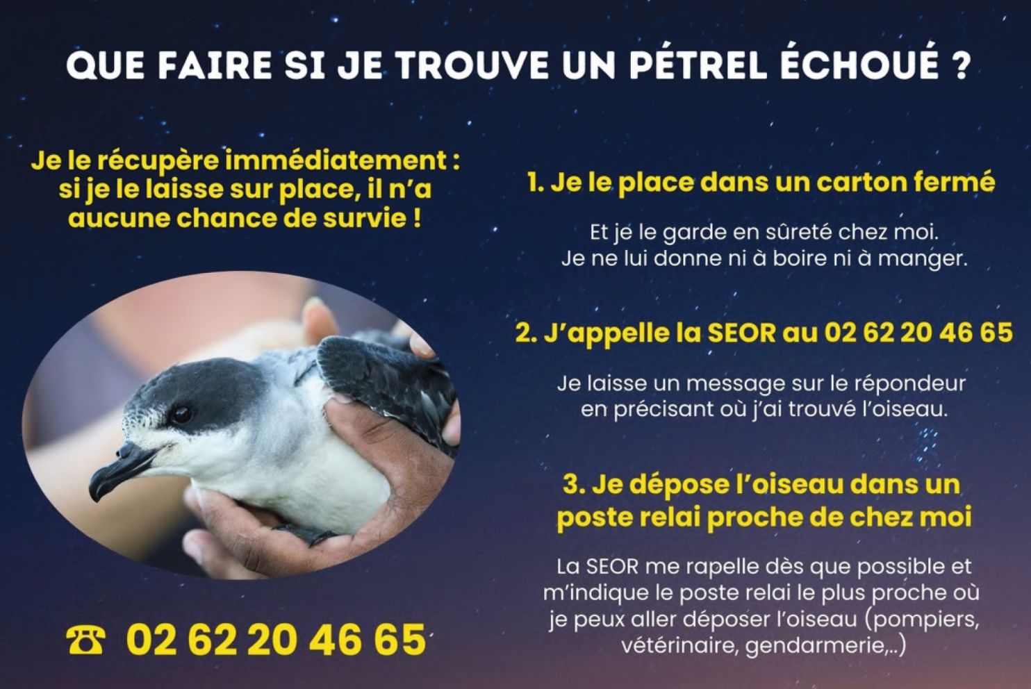 - Contacter la SEOR (Société d'Etudes Ornithologiques de la Réunion) au 0262 20 46 65 qui s'occupera de récupérer l'animal, de le soigner, de le baguer et de le relâcher dans la nature. En principe, le pétrel sera récupéré par un bénévole et/ou une structure relais (pompiers, gendarmes, ...) du réseau de la SEOR.
