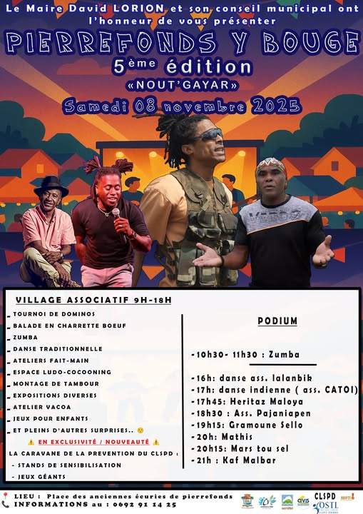 La 5e édition « Nout Gayar » revient avec une programmation éclectique : village associatif, animations pour enfants, ateliers, concerts et tournois. Nouveauté cette année : la caravane de prévention du CLSPD. L’événement se tient sur la place de l’ancienne écurie de Pierrefonds.