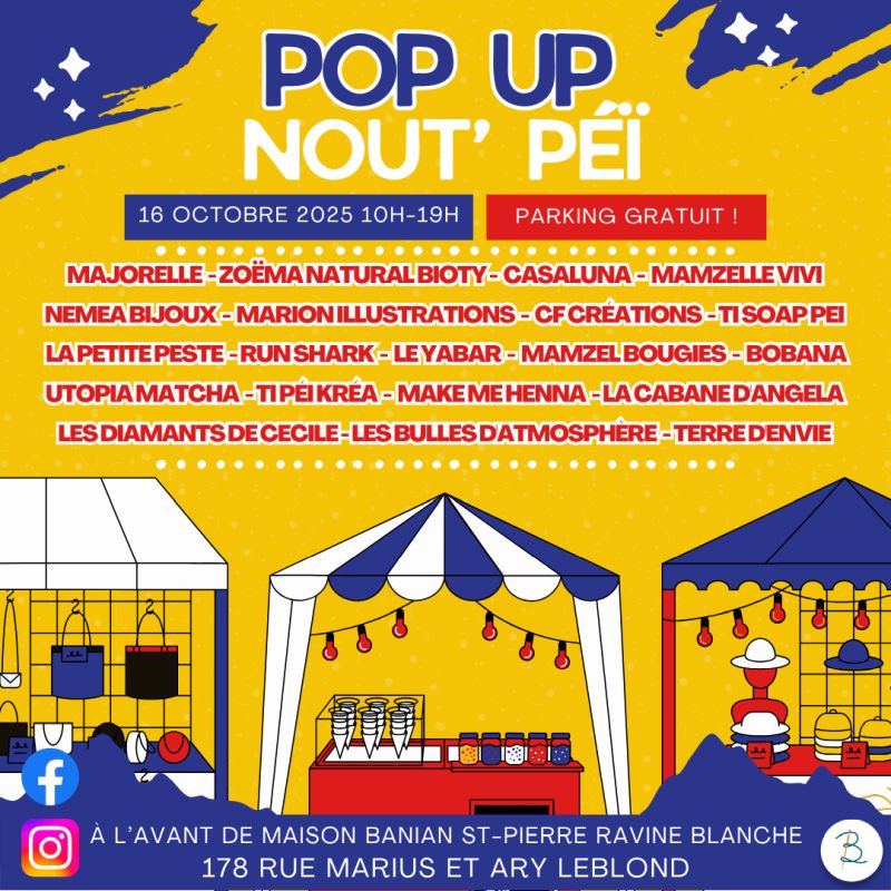 À l’occasion du grand raid, le Pop Up Nout’ Péi réunit une vingtaine de créateurs et artisans péi devant Maison Banian à Saint-Pierre. Mode, bijoux, bougies, déco, bien-être, illustrations et gourmandises locales seront au rendez-vous. Une belle occasion de découvrir les talents réunionnais dans une ambiance conviviale et festive. Parking gratuit sur place.