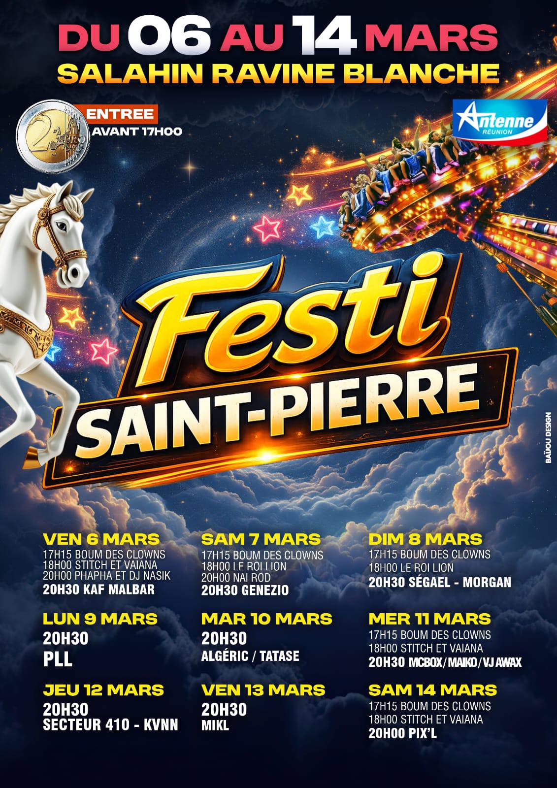 Pendant neuf jours, la Ravine Blanche accueille Festi Saint-Pierre avec manèges, animations familiales et concerts chaque soir.