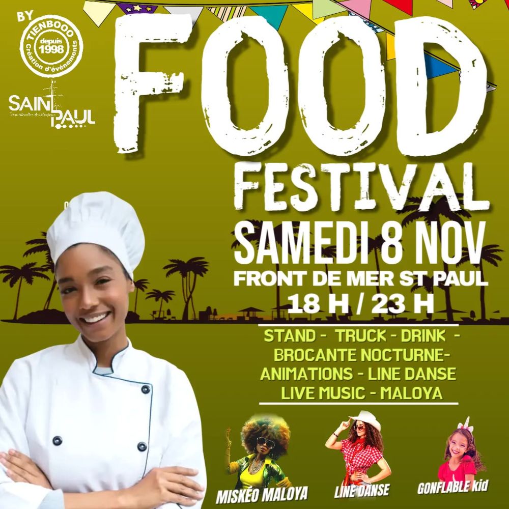 Le Food Festival revient sur le front de mer de Saint-Paul pour une soirée festive entre cuisine du monde, musique et brocante. Organisé par Tienbooo, l'événement mêle street food et culture réunionnaise dans une ambiance conviviale.