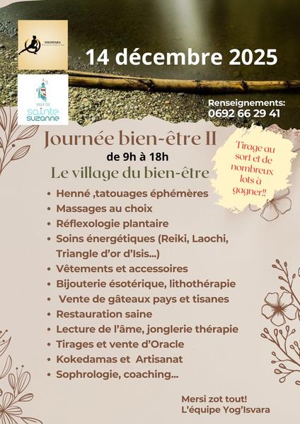 - Village du bien-être de 9h à 18h : henné, massages, réflexologie, soins énergétiques, bijoux ésotériques, kokedamas, artisanat, tisanes, gâteaux pays, oracles, vêtements et accessoires