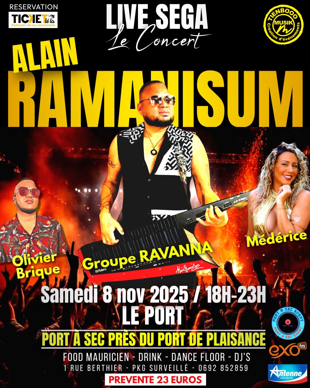Le chanteur emblématique du séga mauricien, Alain Ramanisum, sera en concert live au Port à Sec pour une soirée rythmée, pleine d’énergie et de soleil.