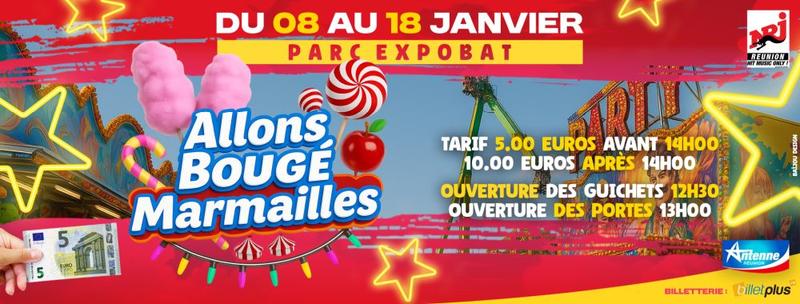“Allons bougé marmailles” transforme le Parc Expobat en un grand parc d’attractions familial accessible à tous. Enfants, ados, parents : chacun y trouve son compte avec des manèges gratuits et illimités dans un cadre sécurisé. Billets disponibles en ligne ou sur place.