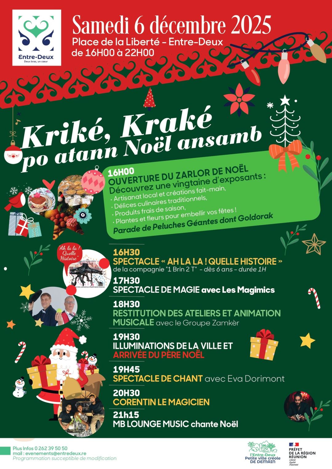 Le Zarlor de Noël revient à l’Entre-Deux avec une vingtaine d’exposants pour préparer les fêtes. Dès 16h, le public pourra flâner entre créations artisanales, gourmandises locales, plantes et fleurs, tout en profitant d’un programme festif avec spectacles, concerts, magie et parade de peluches géantes.