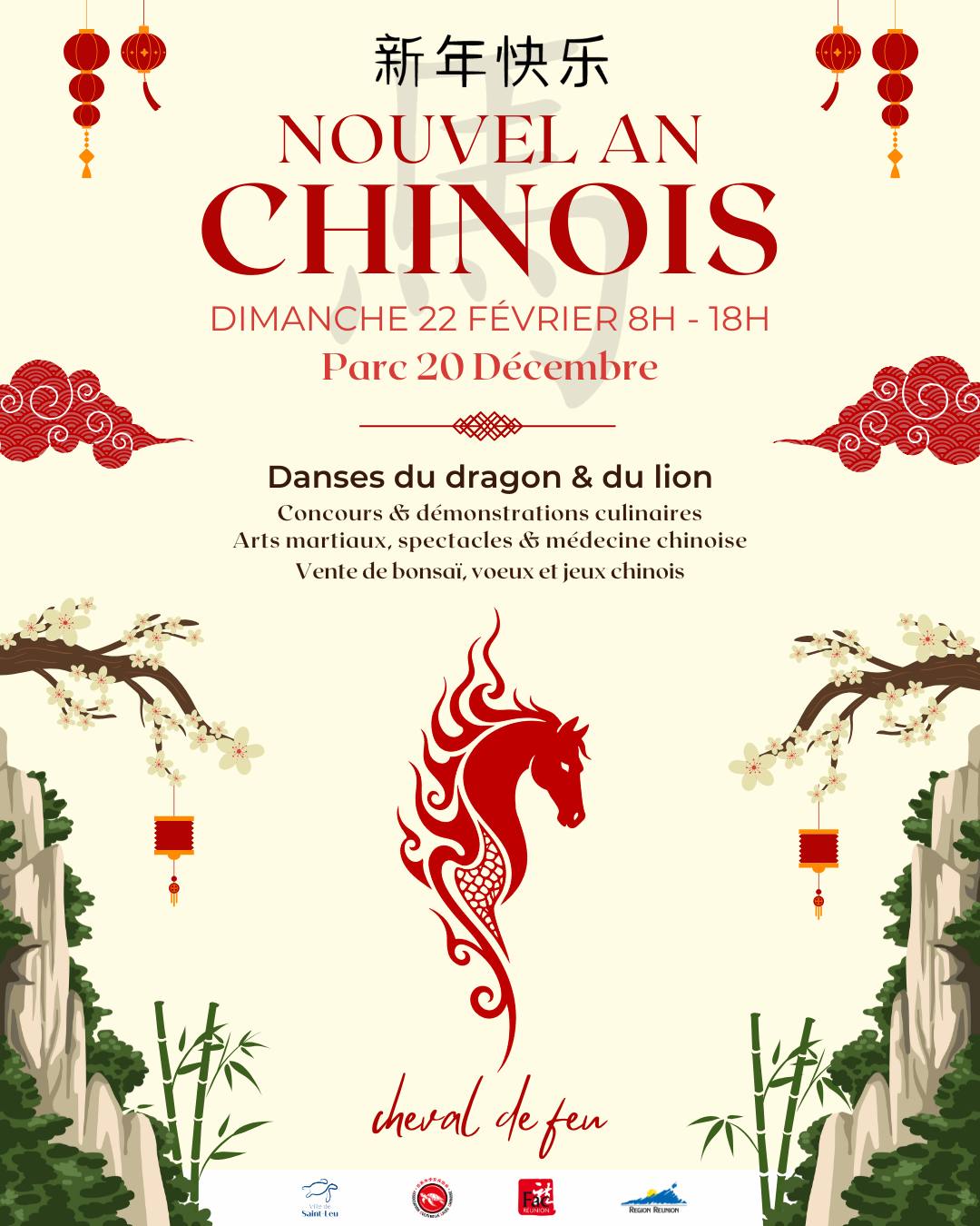 La Ville de Saint-Leu vous invite à fêter la nouvelle année chinoise le dimanche 22 février 2026 à partir de 8h dans le parc du 20 Décembre au centre de Saint-Leu. Place à l'année du Cheval de Feu avec une journée de festivités autour de la culture chinoise avec danses du dragon et du lion, démonstrations culinaires, spectacles et arts martiaux. Des animations se tiendront également dans les médiathèques et bibliothèques du réseau Laleu Kiltir.