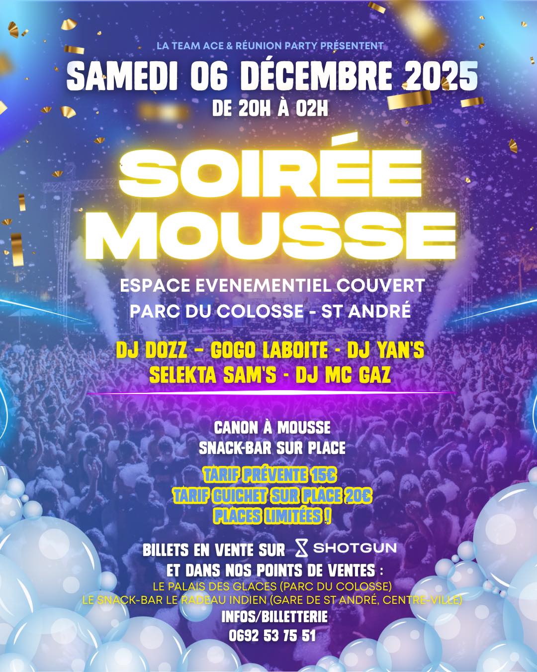 - Plus d’infos / sources : voir l’affiche - Infos/Billetterie 0692 53 75 51 - Un événement signé ACE x Réunion Party en partenariat avec Les Jeunes de Saint-André