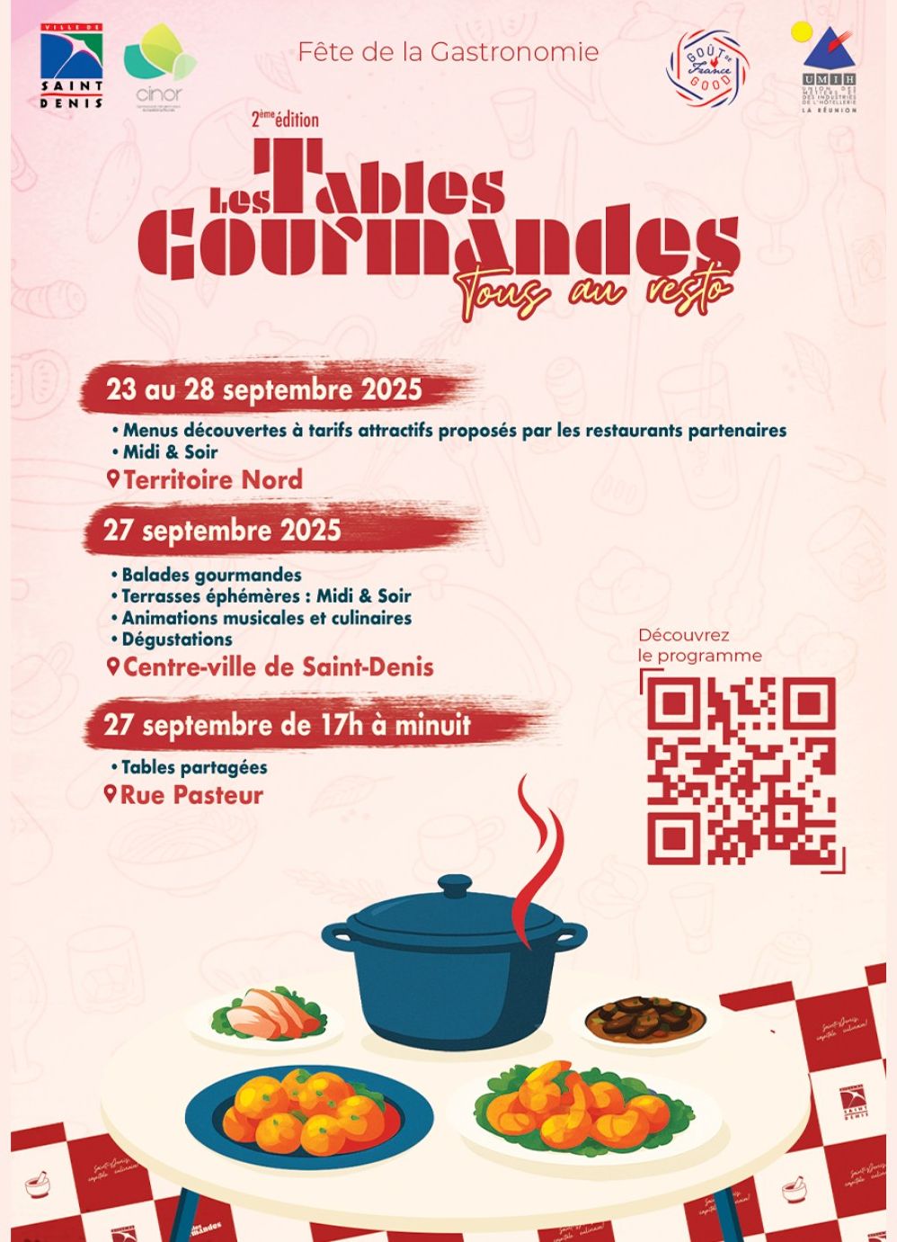À l’occasion de la Fête de la gastronomie, la Ville de Saint-Denis et ses partenaires proposent une nouvelle édition des Tables Gourmandes. Tout au long de la semaine, les restaurateurs partenaires invitent le public à découvrir des menus à tarifs attractifs. La journée du samedi 27 septembre sera le point fort de l’événement, avec balades gourmandes, terrasses éphémères, animations musicales et culinaires, dégustations et grandes tables partagées dans la rue Pasteur transformée en espace piéton festif.