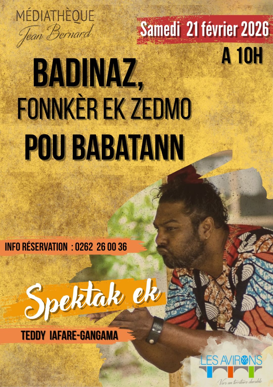 Ce spectacle, intitulé « Badinaz, Fonnkèr ek Zedmo pou Babatann », est proposé par Teddy Iafare-Gangama. Destiné aux petits et grands, il met à l’honneur la langue créole à travers musique, poésie et jeux de mots.