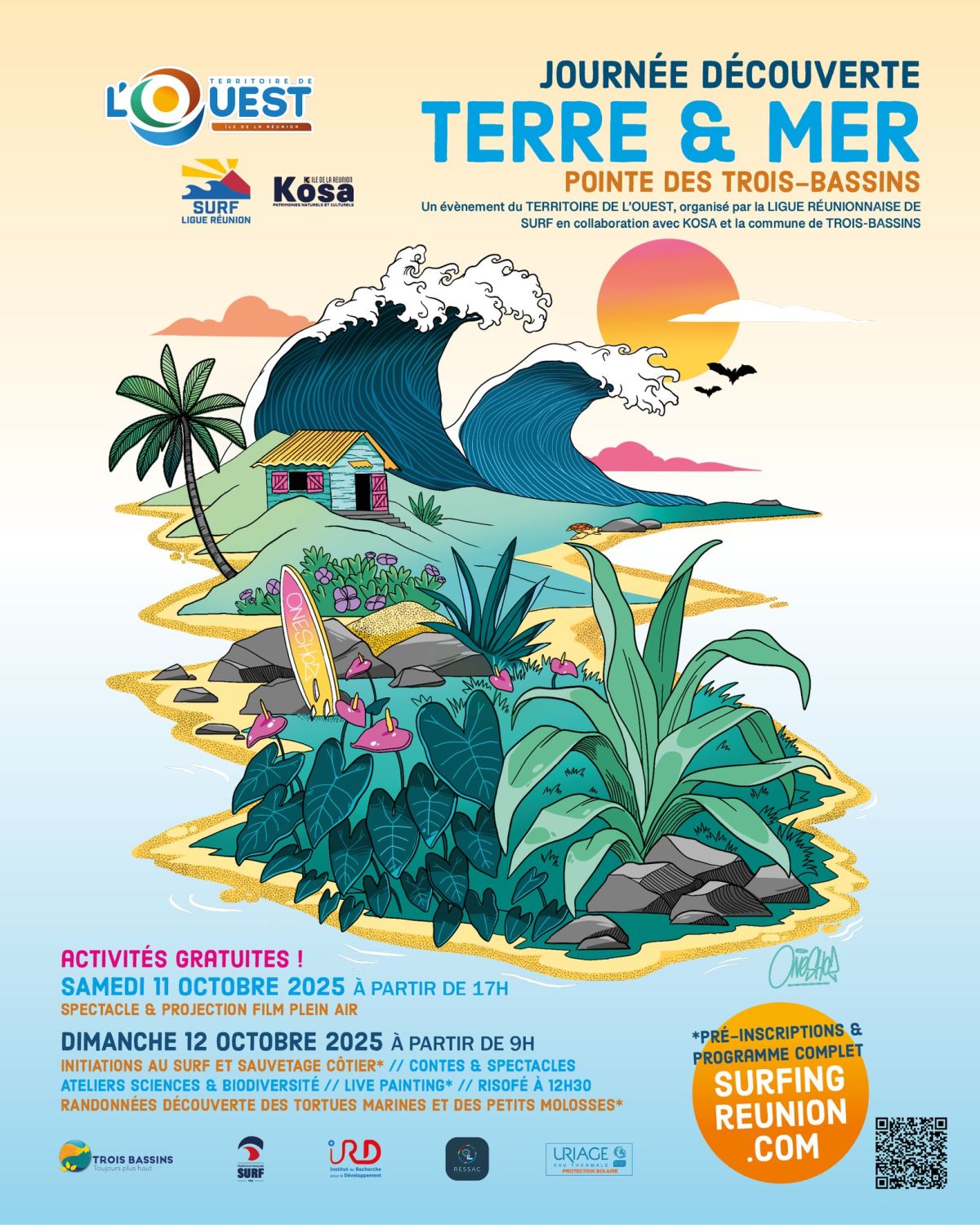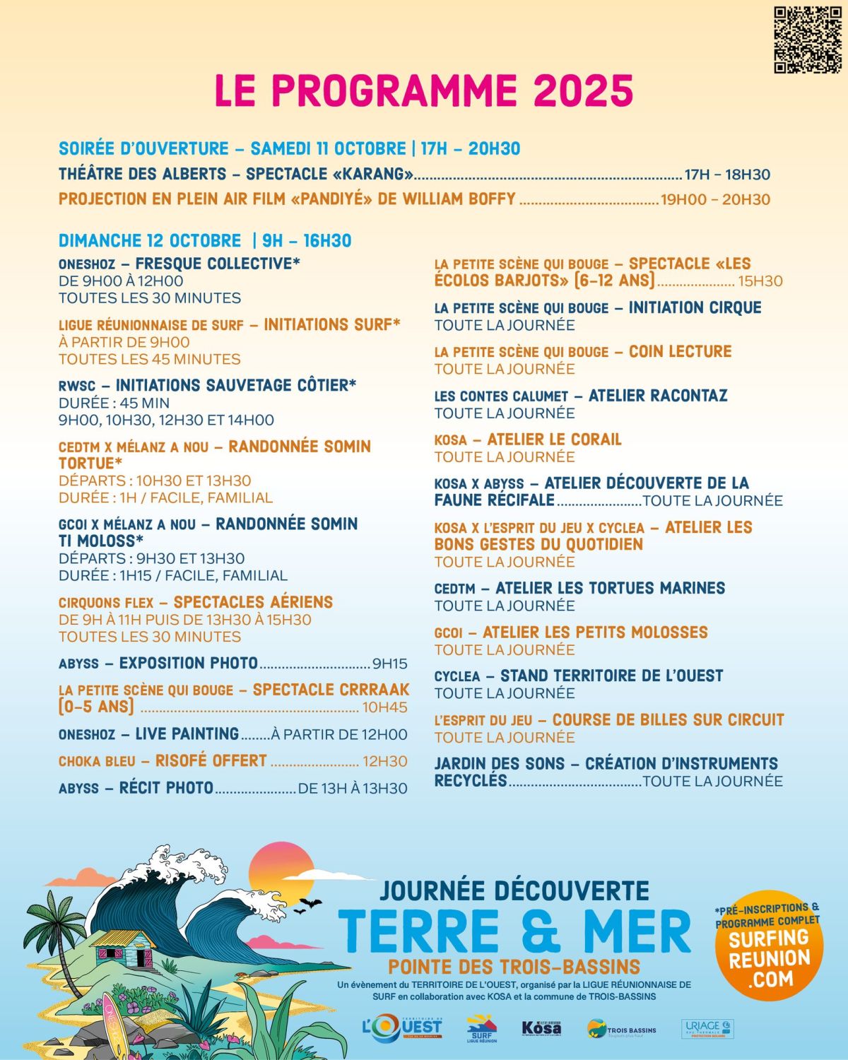 - Plus d’infos / Sources : voir l’affiche – Territoire de l’Ouest, Ligue Réunionnaise de Surf, KOSA et Ville de Trois-Bassins