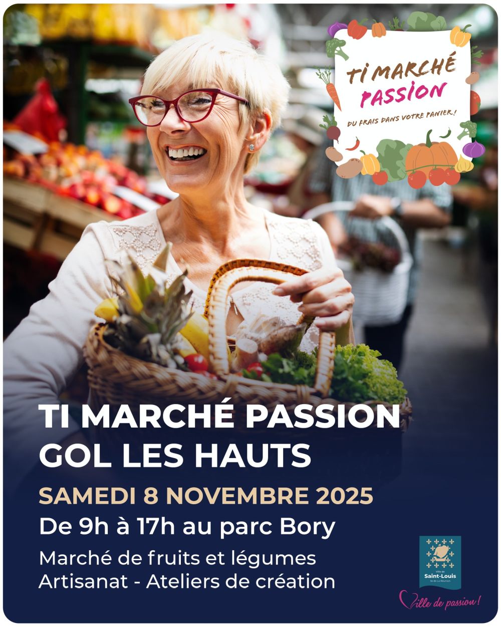 Un marché de proximité avec des produits frais, de l’artisanat et des ateliers créatifs au cœur des hauts de Saint-Louis. Le Ti Marché Passion s’installe au parc Bory à Gol les Hauts. Cette édition valorise les producteurs et artisans locaux dans une ambiance conviviale et authentique. Fruits, légumes, savoir-faire et ateliers de création seront au programme toute la journée.