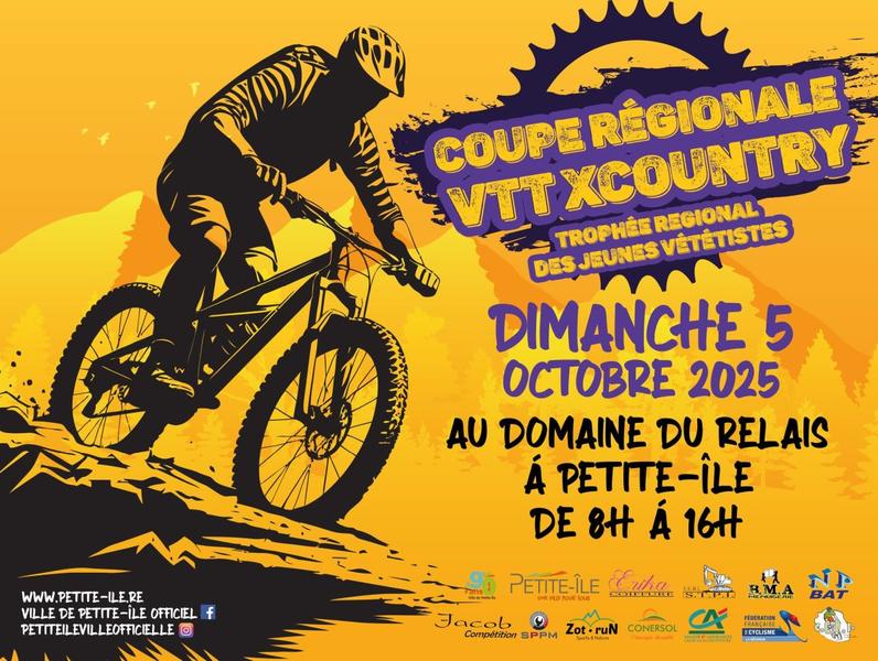 La Coupe régionale VTT XCountry investit le Domaine du Relais à Petite-Île. De 8h à 16h, le public est invité à découvrir cette discipline spectaculaire et encourager les jeunes vététistes engagés dans le trophée régional. Un moment fort à noter dans vos agendas.