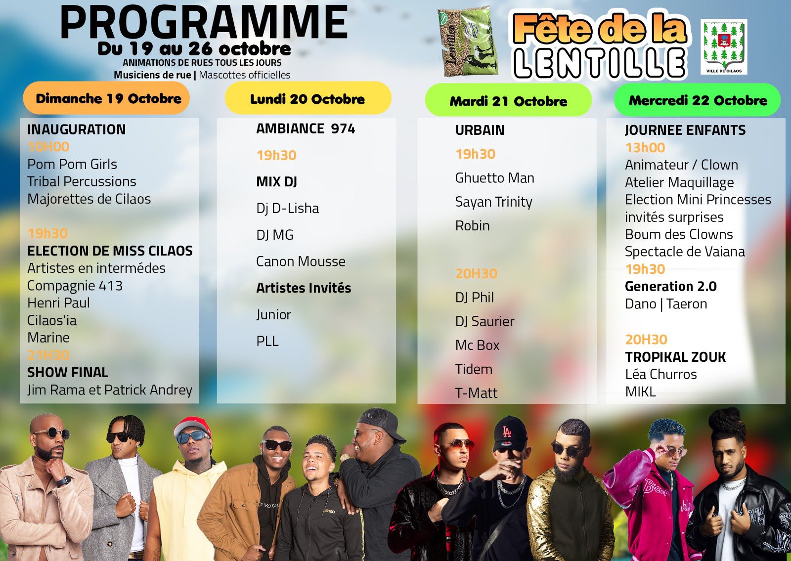 La fête de la lentille aura lieu cette année du 19 au 26 octobre 2025. Une semaine entière de festivités, de concerts, d’animations populaires, de marchés du terroir, et bien sûr de moments forts autour de la lentille de Cilaos, fleuron de notre terroir. A n'en pas douter, les réunionnais seront certainement nombreux à profiter de la fête de la lentille pour se rendre dans le magnifique cirque de Cilaos durant les vacances scolaires.